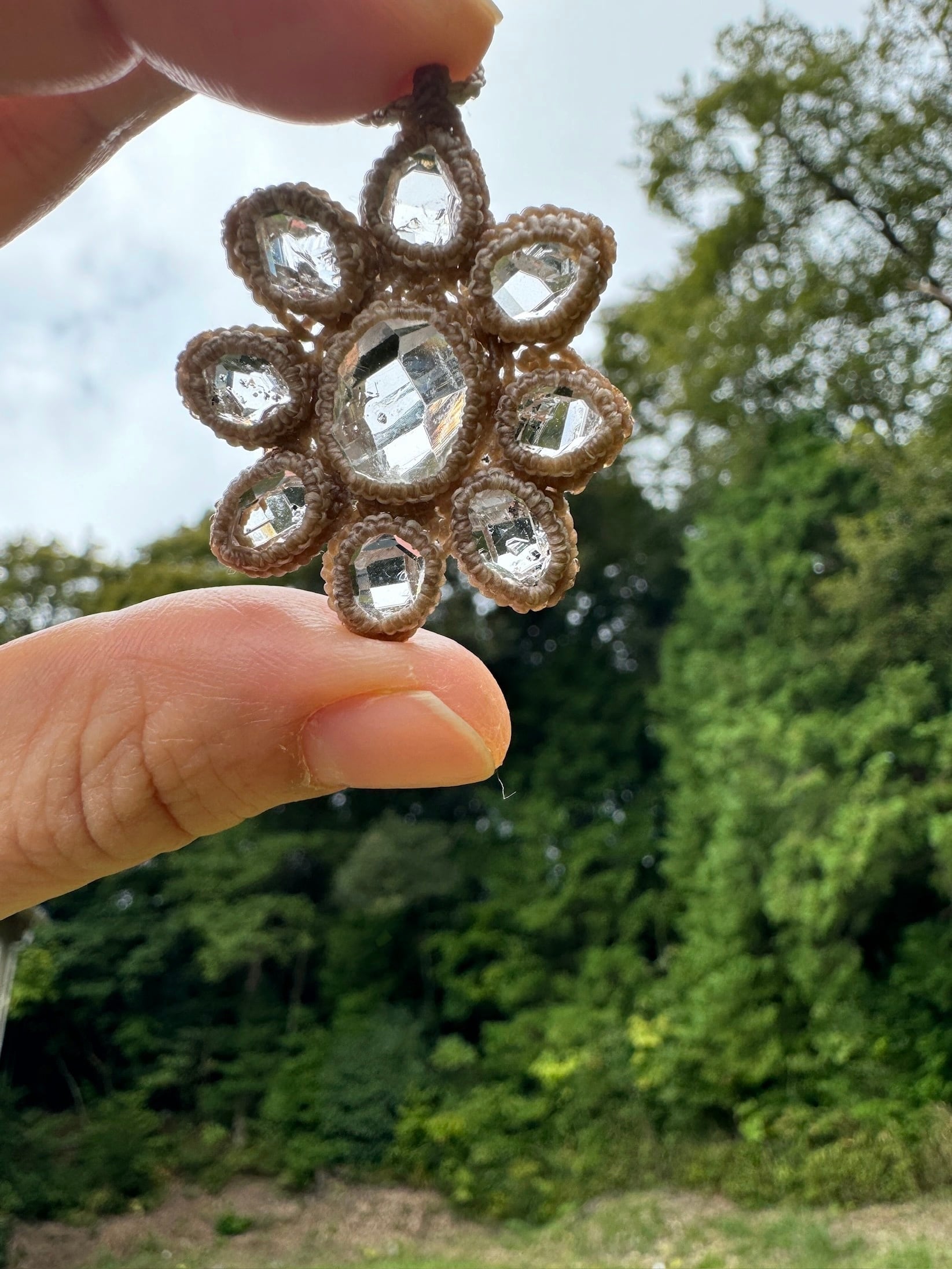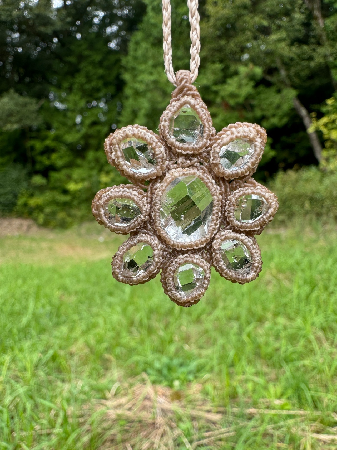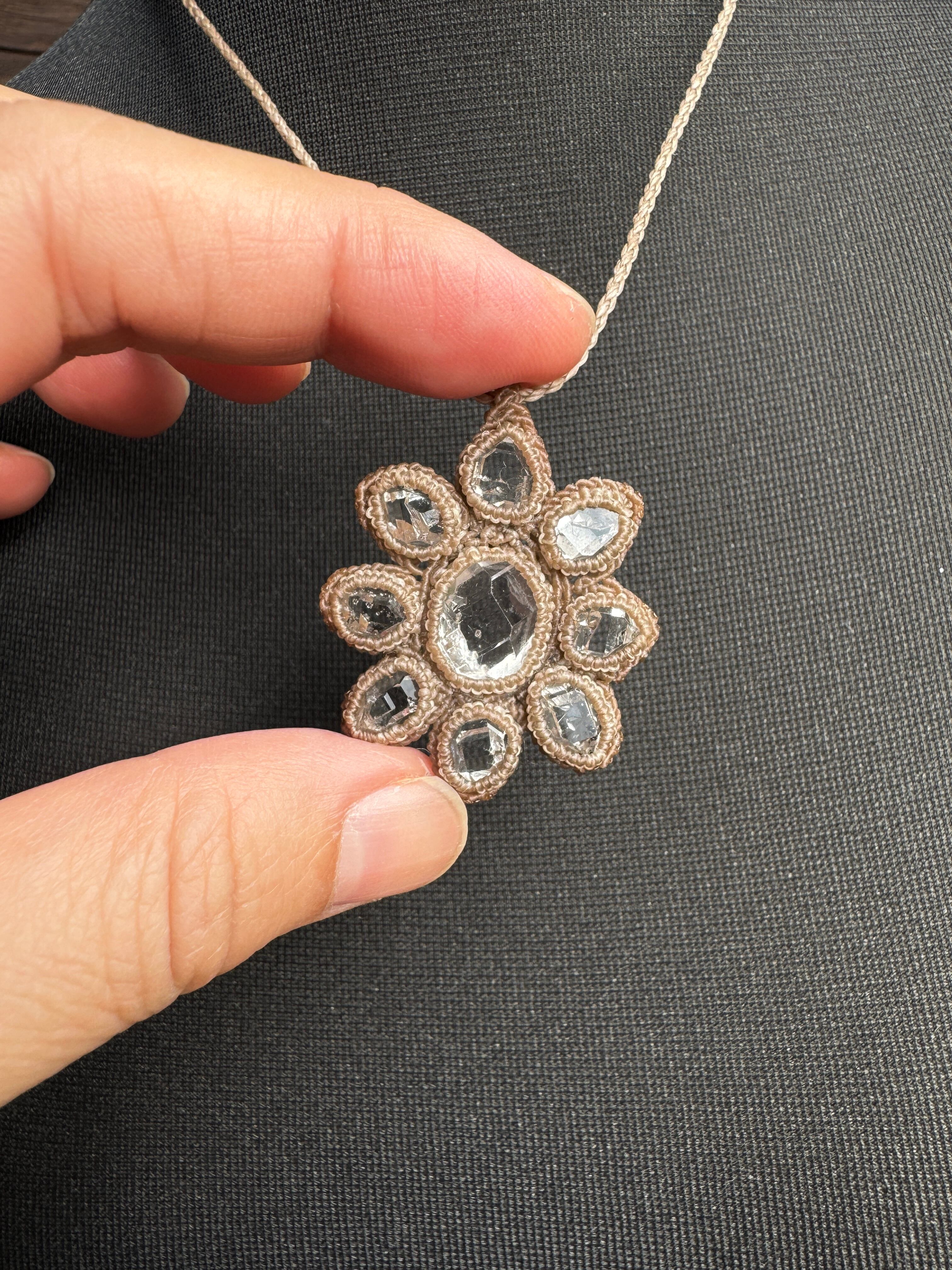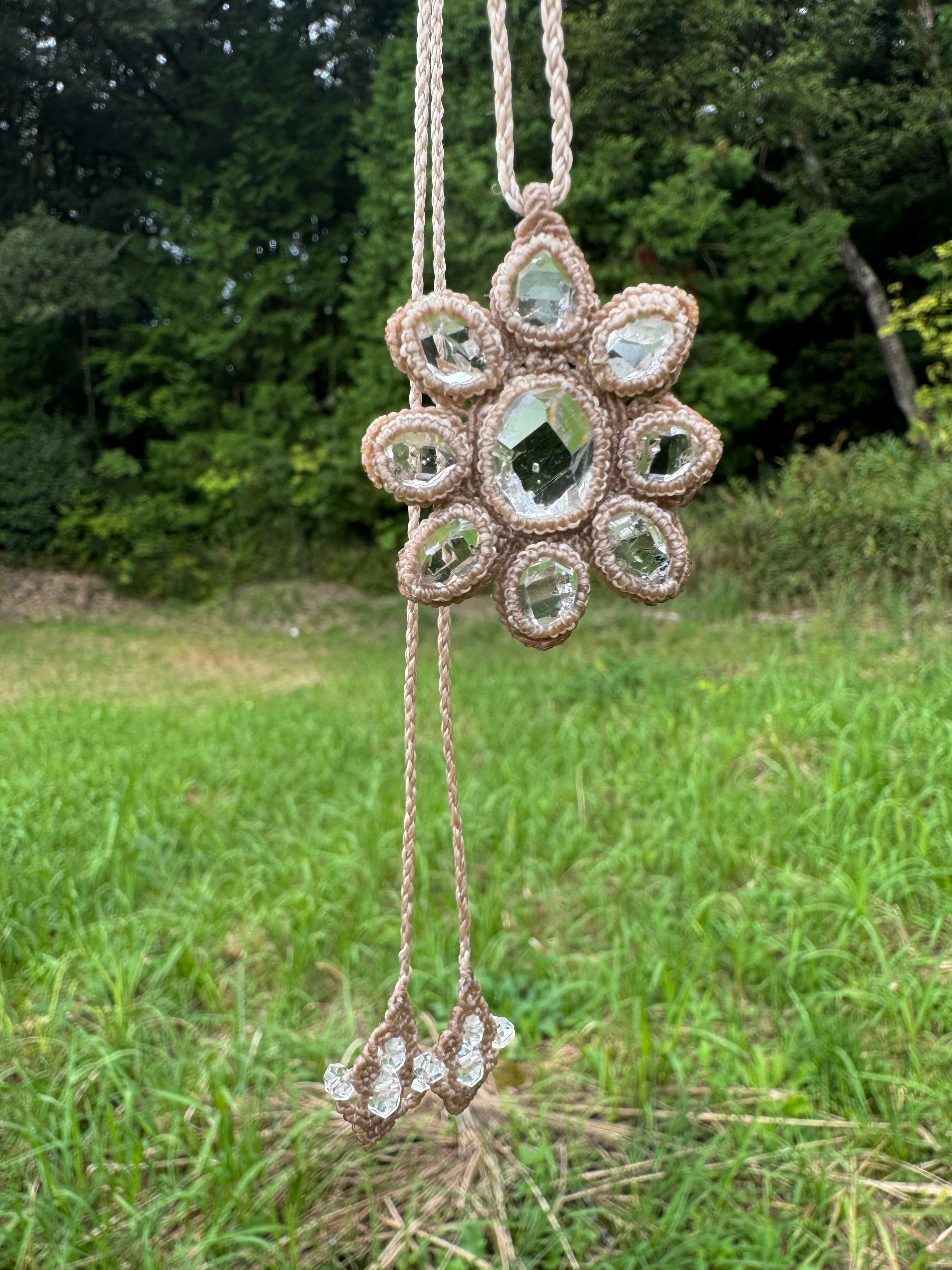 ハーキマーダイヤモンドの原石を9つ使用したマクラメ編みペンダントになります。