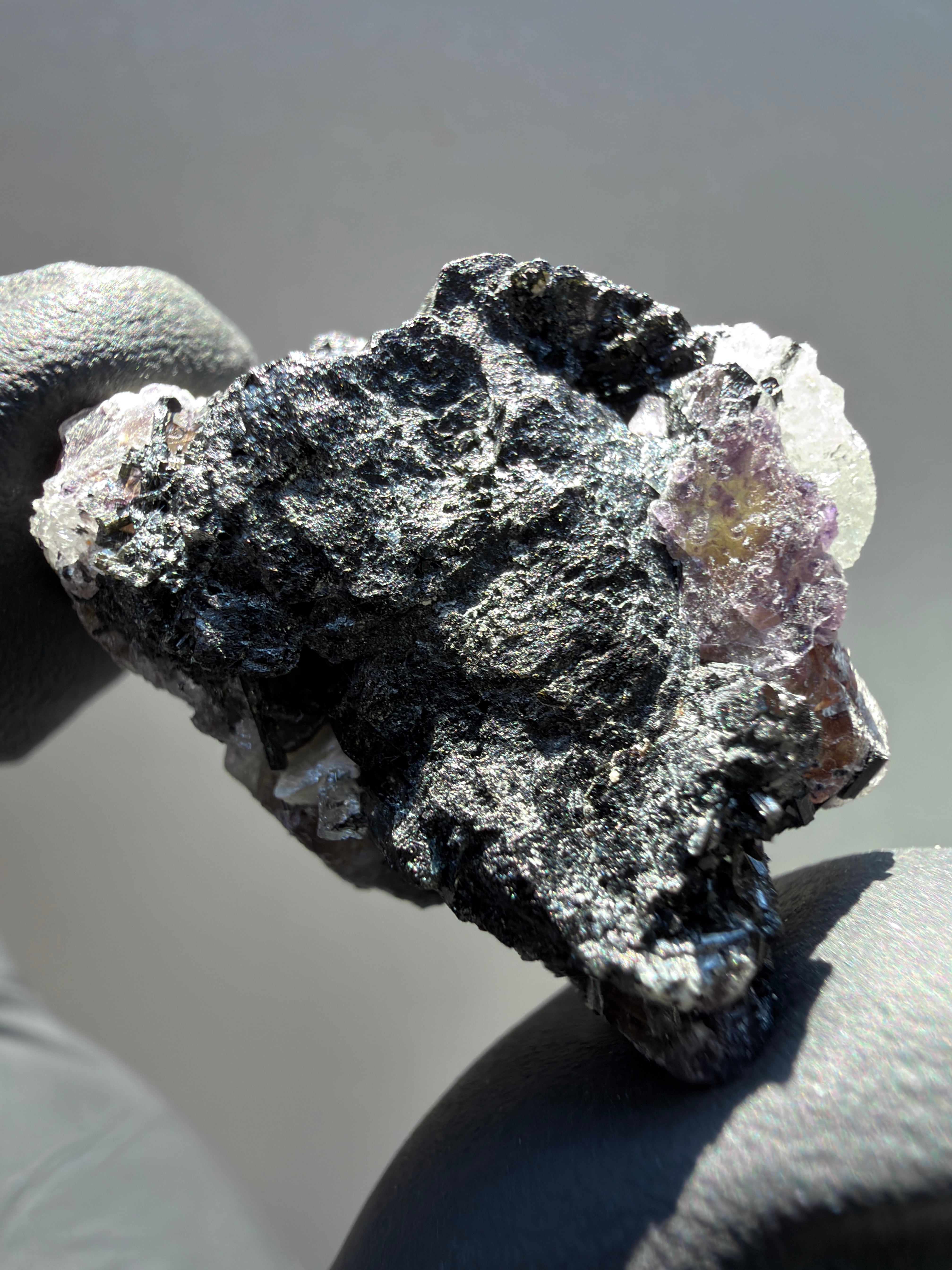 ブラックトルマリンをベースにしてフローライトやマイカを伴った華やかなゴシェナイトクラスター